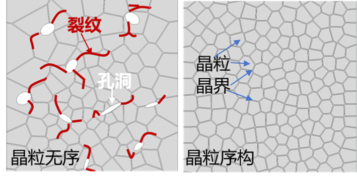 图3.(a) 晶粒无序和(b)晶粒有序的陶瓷微观形貌示意图