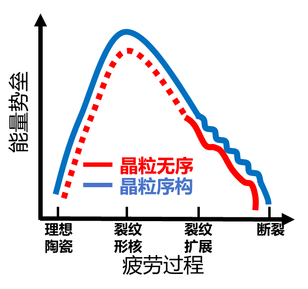 图5. 晶粒无序和晶粒序构陶瓷疲劳过程能量势垒变化示意图