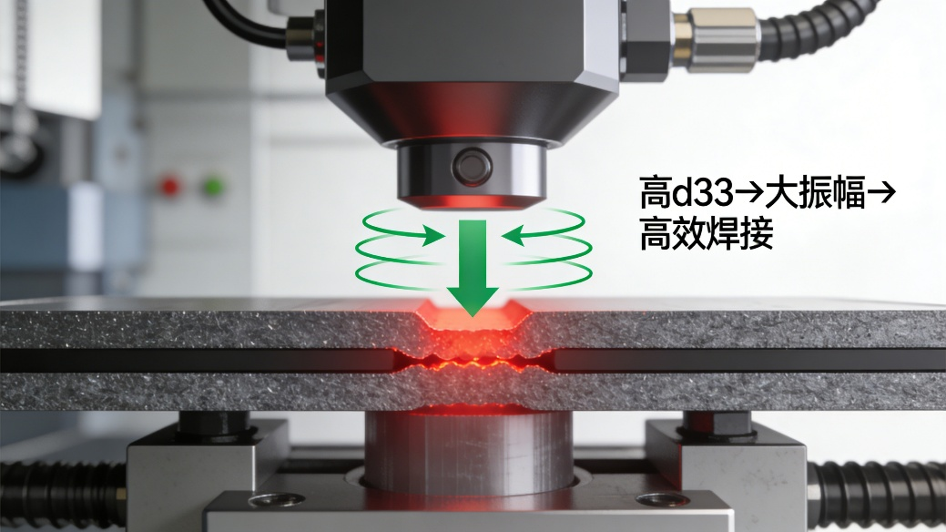 压电常数d33是衡量材料逆压电效应强弱的核心参数,定义为在单位电场(E)激励下,材料沿电场方向产生的应变(S)大小,即d33=S/E。其单位是米/伏(m/V)或更常用的库仑/牛顿(C/N)。d33值越高,意味着施加相同驱动电压时,材料产生的振动位移(振幅)越大。在大功率超声换能器中,d33直接决定了换能器的最大输出声功率潜力。以体外冲击波碎石(ESWL)为例,其治疗原理是利用聚焦的高强度声压脉冲在结石内部产生拉伸应力使其破碎。产生高峰值声压的前提,是换能器振面能产生足够大的瞬态位移。高d33陶瓷在高压脉冲电场驱动下,能产生更大的初始振幅,经声学聚焦后形成更强的冲击波。同样,在超声焊接中,焊头末端的振动幅度直接影响摩擦生热量和材料融合深度,高d33是实现高效焊接的基础,如图2所示。因此,对于任何追求高输出、大振幅的应用,高d33是首要条件。然而,孤立追求高d33是危险的,因为它往往伴随着畴壁运动过于“松驰”,会导致材料在交变电场下易发热、易老化,这便引出了对效率和稳定性的需求。