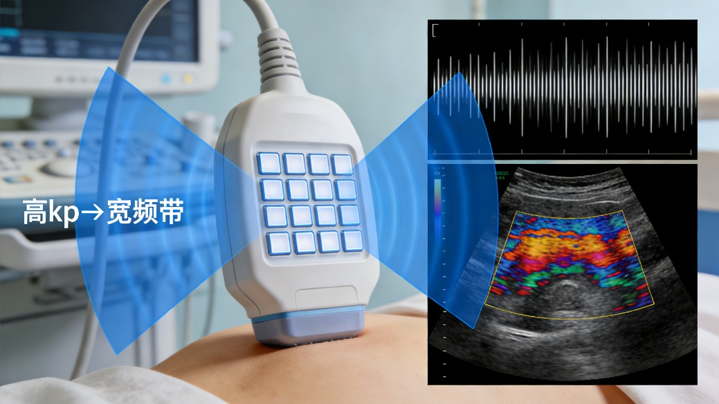 机电耦合系数k(常用平面耦合系数kp或厚度耦合系数kt)是一个无量纲参数,其物理意义是压电体中机械能与电能相互耦合程度的度量。它定义为转换的机械能与输入的电能(或反之)之比的平方根。k值越高,表示电能与机械能之间的转换越充分,能量“浪费”在非压电效应(如介电极化损耗、非谐振形变)上的比例越低。kp是评价换能器带宽和能量转换综合效率的关键。一个高kp的压电陶瓷,意味着它能在更宽的频率范围内保持有效的能量转换。这对于高频超声换能器和宽带水声换能器至关重要。例如,在医用超声成像的阵列探头中,高kp不仅提升了发射灵敏度,还拓宽了探头的频带,从而获得更高的轴向分辨率(短脉冲)和更丰富的组织谐波信息,如图3所示。在大功率超声清洗中,虽然追求连续波下的高Qm,但适中的高kp确保了电能能有效地“注入”到材料的机械谐振模式中,从源头上提升系统总效率。kp与d33密切相关,但并非同一概念;d33关乎“输出多大”,kp更关乎“转换多顺”。优化kp,是提升系统能效比、实现绿色功率超声的核心。