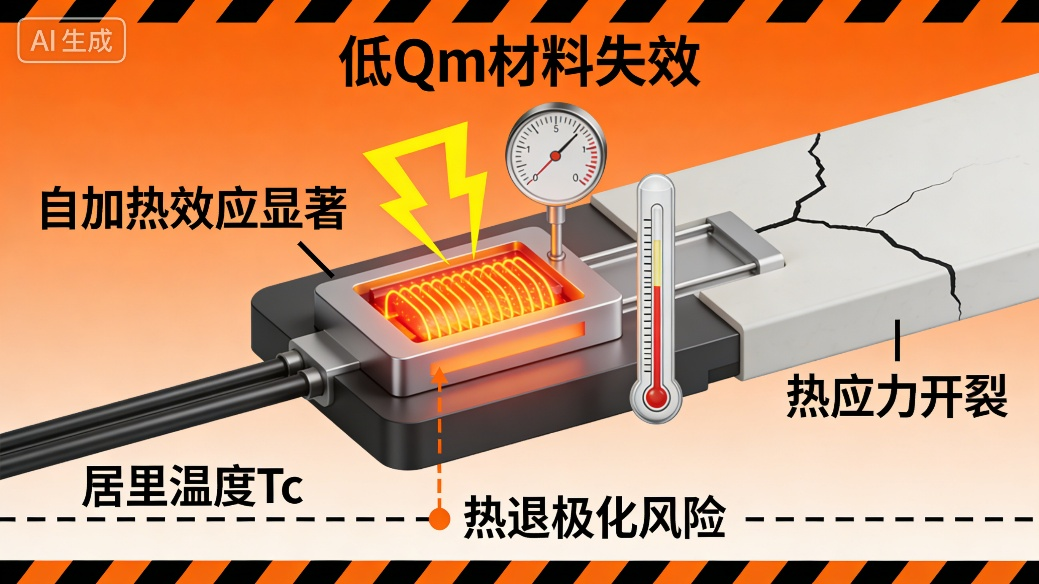 图4.低Qm材料在高驱动下的发热及失效风险示意图