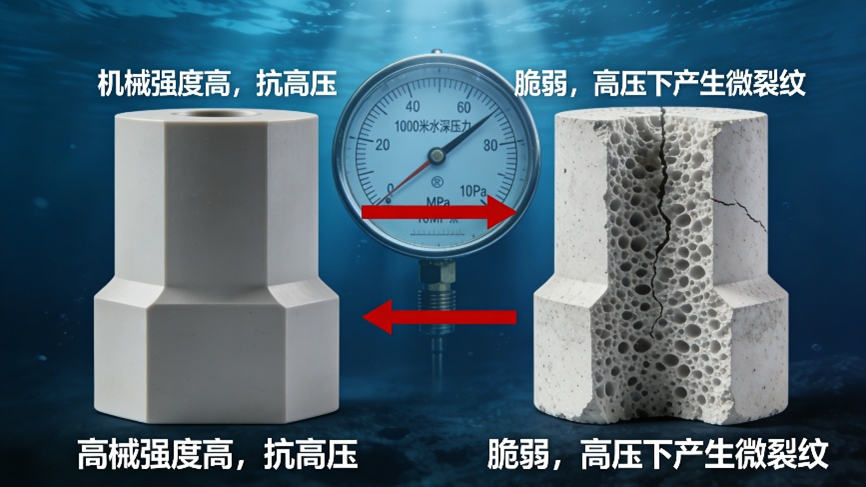 密度ρ是材料的基本物理属性。对于PZT陶瓷而言,我们更关注其相对密度,即实际体积密度与理论晶体密度之比。高相对密度(>98%)意味着陶瓷体内气孔、缺陷极少,微观结构致密均匀。高密度与高致密性,是材料高机械强度、高介电强度和良好热导率的物理基础。首先,机械强度:大功率换能器,特别是用于深海声呐的换能器,需要承受极高的静水压力(数十兆帕)。多孔、低密度的陶瓷是脆弱的,在高压下易产生微裂纹甚至崩塌,如图5所示。高致密陶瓷则能提供可靠的机械支撑。其次,介电强度:为了获得大功率输出,常需施加很高的驱动电场(kV/cm量级)。气孔和缺陷是电场集中的薄弱点,容易引发局部击穿,导致整个器件失效。致密无瑕的陶瓷拥有更高的介电击穿场强,允许使用更高驱动电压,从而提升输出。再者,热管理:陶瓷的热导率虽不高,但致密材料的热传导能力仍优于多孔材料。这有利于将工作中产生的热量(源于介电损耗和机械损耗)更均匀地散发出去,避免局部过热。因此,高密度并非一个附属指标,而是保障高功率下可靠性与安全性的基石。通过热压烧结、热等静压等先进工艺追求极致致密化,是现代大功率PZT制备的关键一环。