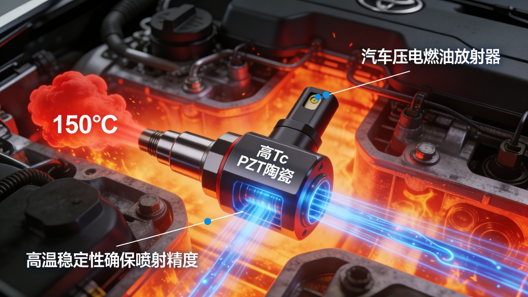 居里温度Tc是压电材料从铁电相(具有自发极化)转变为顺电相(自发极化消失)的相变温度。高于Tc,压电性完全消失。此外,在远低于Tc的范围内,材料的d33、kp、介电常数等参数也会随温度变化,其变化率称为温度系数。Tc定义了材料工作温度的绝对上限,而温度稳定性则决定了其在变温环境下性能的可靠程度。在大功率工作中,自加热不可避免。一个具有高Tc(如>300°C)的PZT陶瓷,为工作温度提供了宽裕的安全边际,确保即使在极端工况下也不会发生灾难性的热退极化。例如,汽车压电燃油喷射器的压电执行器工作在发动机舱高温环境中,如图6所示;航空航天用超声电机可能面临剧烈温度变化。高Tc材料是这些应用的必然选择。同时,低的温度系数意味着随着器件温升,其谐振频率、阻抗等关键参数漂移小。这对于频率跟踪电路设计至关重要。如果材料性能随温度变化剧烈,驱动电路可能“失谐”,导致效率下降甚至停振。因此,通过组分设计(如引入某些离子以提高Tc、展宽相变峰)来优化温度稳定性,是确保大功率器件在全工况范围内可靠工作的必要条件。