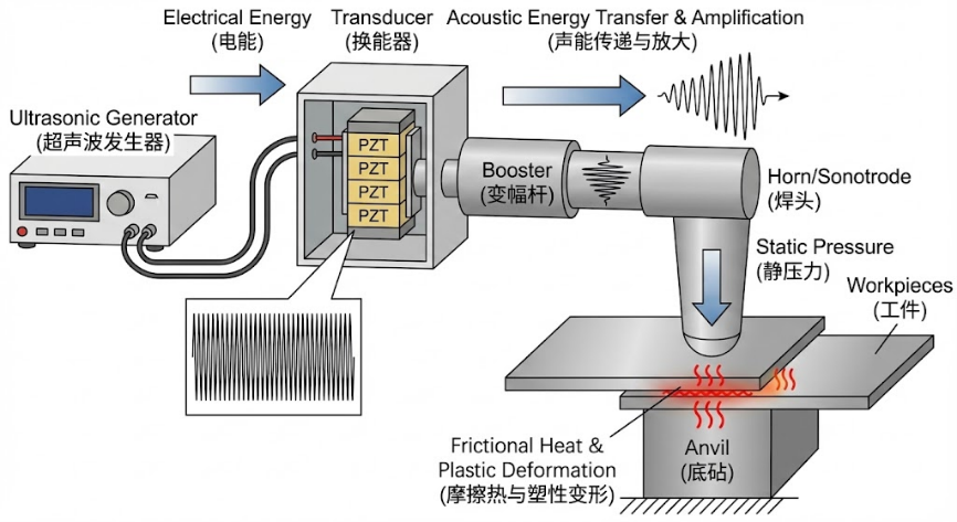 图4. 大功率超声波金属焊接机工作原理与声能传递示意图
